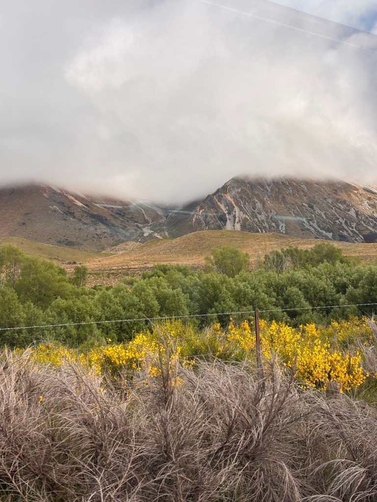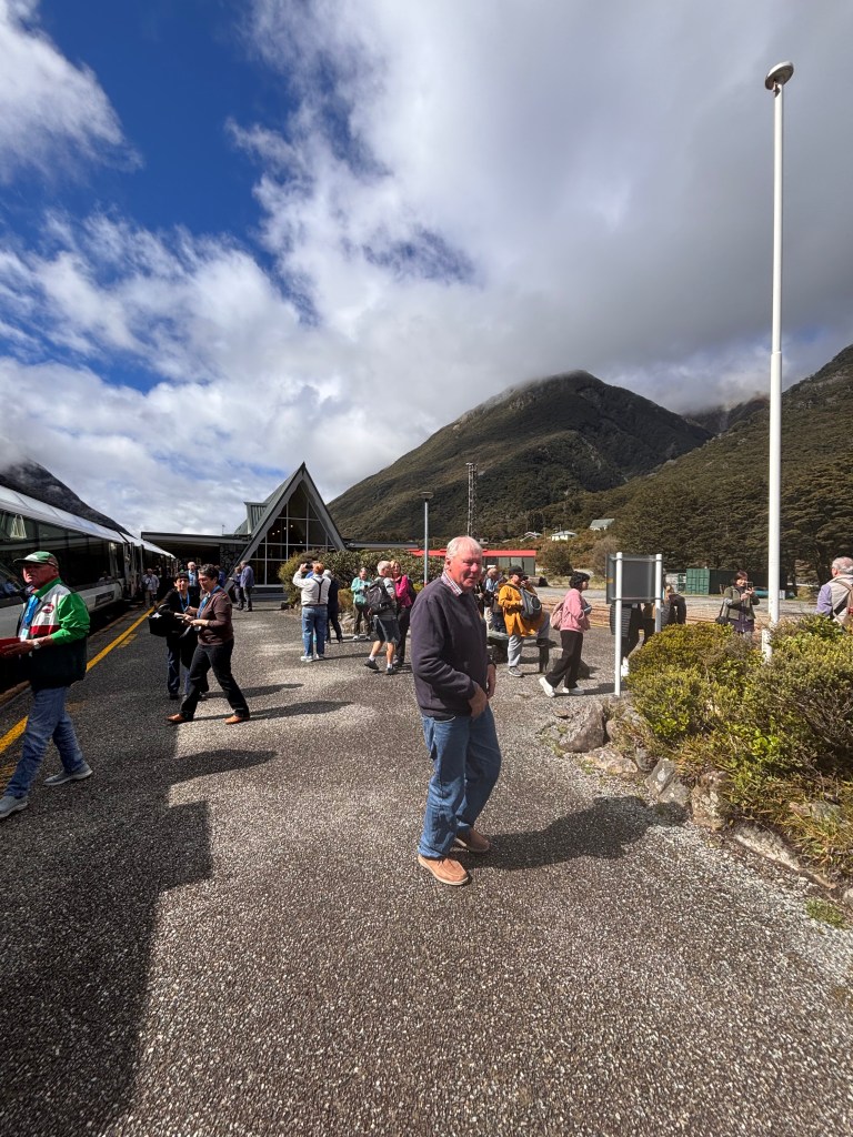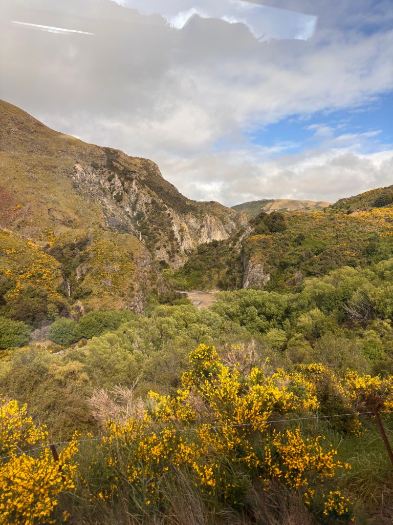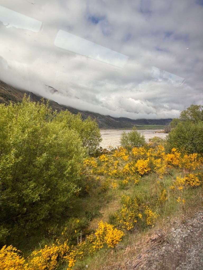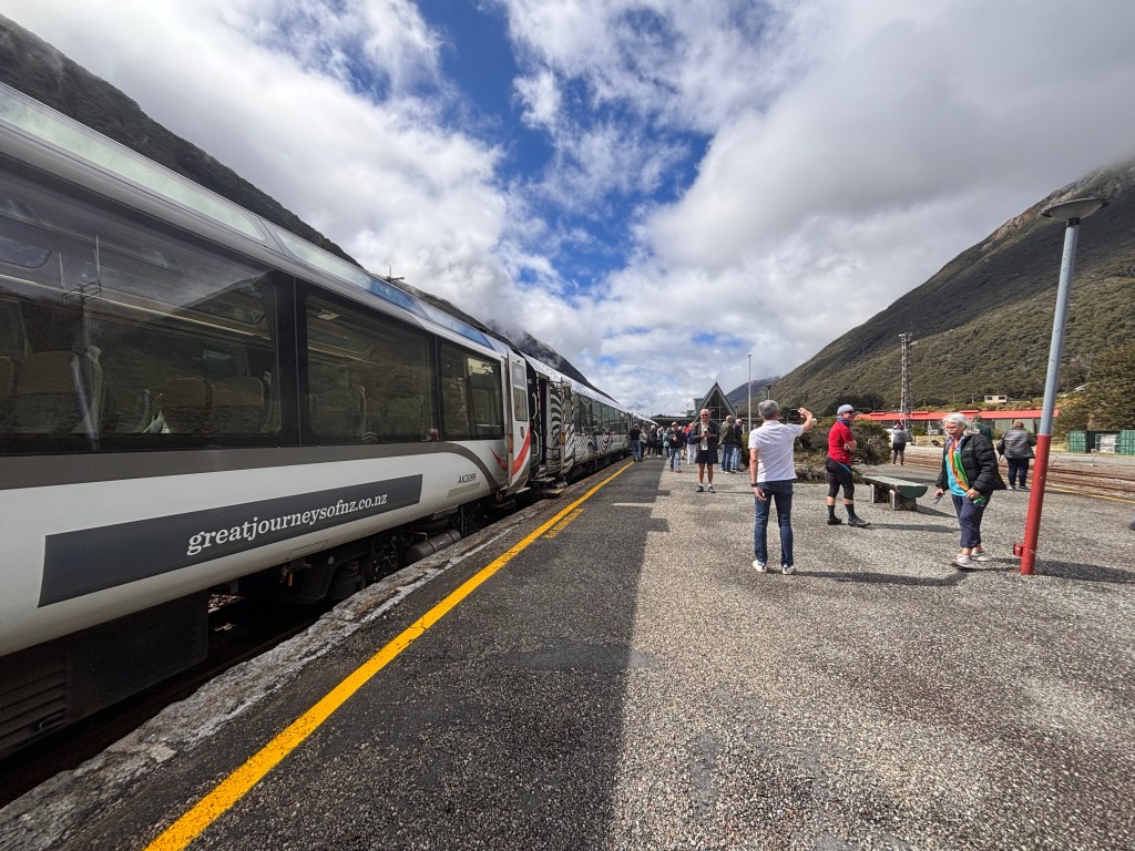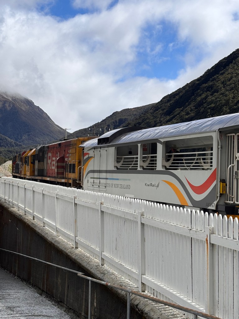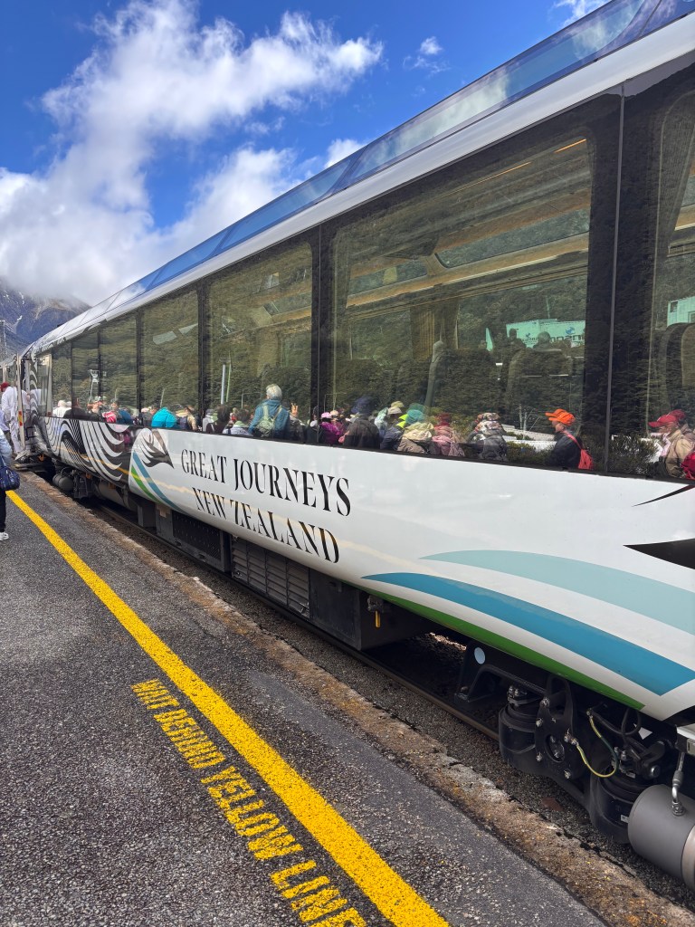 Once aboard, the train glided out so smoothly we hardly noticed we were moving. The panoramic viewing windows framed the landscapes like living postcards. Midway through the journey, we stopped briefly at Arthur’s Pass, a tiny alpine village nestled high in the mountains. We stepped off for some fresh, cool air and took a few photos of the train against the dramatic backdrop of peaks and clouds — the perfect postcard moment before reboarding.