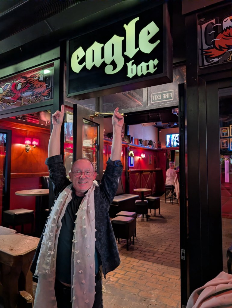 Having eaten so well on the train, neither of us was in the mood for a full dinner. Instead, we decided to stretch our legs and head out for a drink. Google Maps suggested a short walk, but in true big-city fashion we managed to take a longer, more circuitous route before finally finding The Eagle. Located on a lively block, it was one of several gay bars in the area, with The Saloon just a few steps away. We made a mental note to return and explore more of them during our three-day, four-night stay.