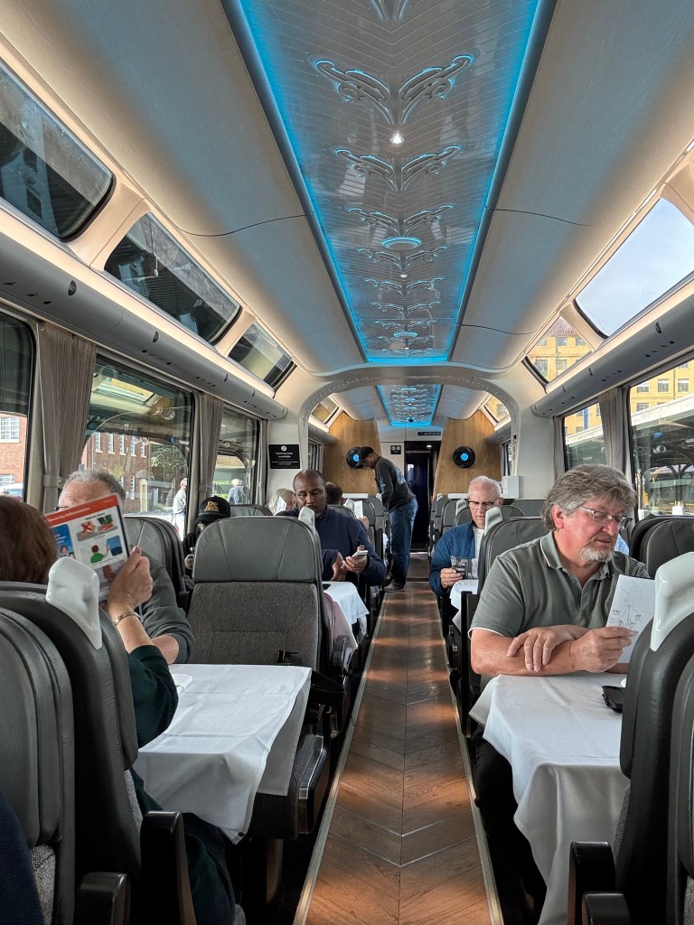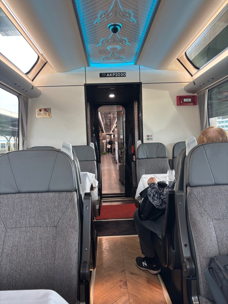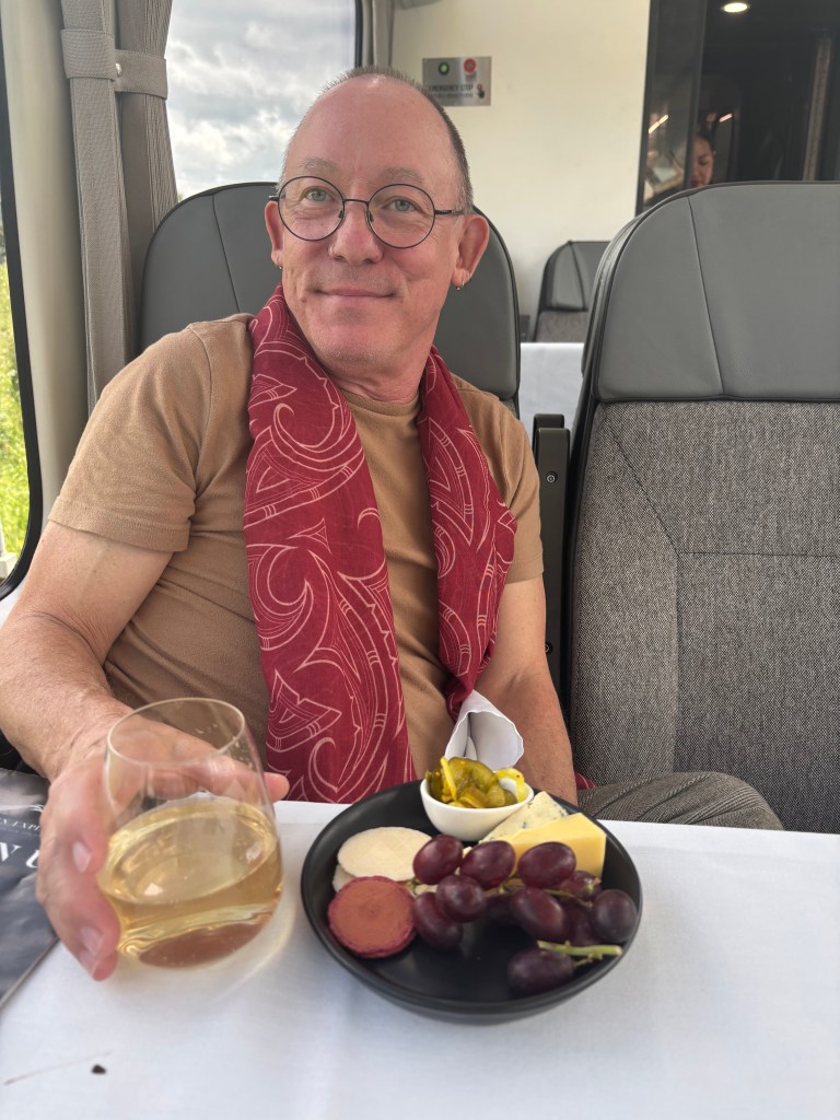 Stephen was thoughtful in booking us into Scenic Plus on the Northern Explorer—KiwiRail’s version of first class. It transforms the journey from simple transport into a curated experience. Scenic Plus passengers travel in a dedicated carriage with wide, reclining seats arranged to face the windows, making the most of the panoramic glass that frames the landscapes rolling by: volcanic plateaus, deep gorges, and endless stretches of green pasture.