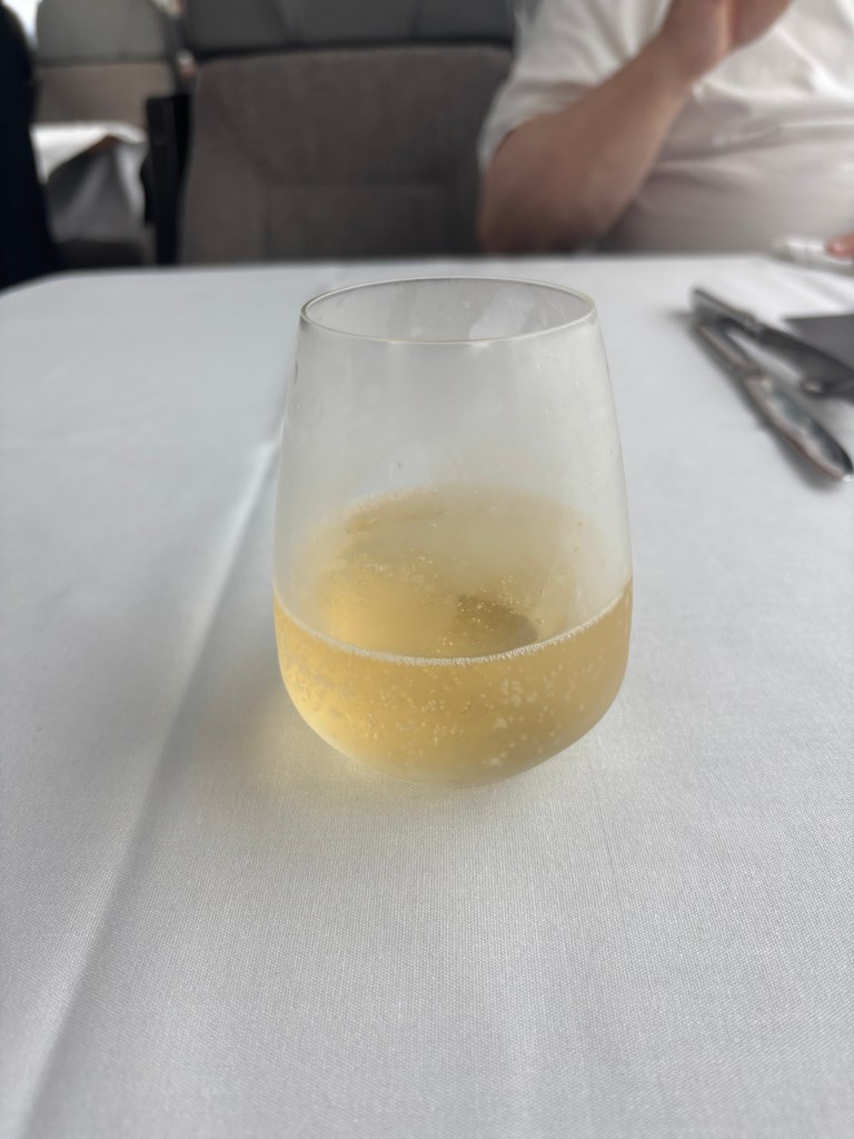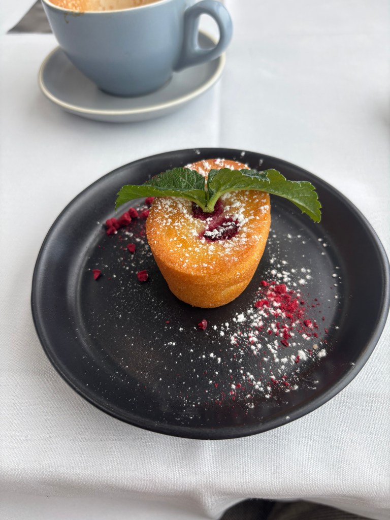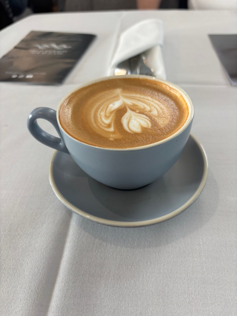 We boarded our car and found our table, pleasantly surprised to see that the coach was only half full. Each couple had their own table, which made settling in even more comfortable. Before the train even left the platform, attendants arrived with hot beverages — and we both chose a much-needed latte. Shortly after came a small orchard-fruit friand, light, soft, and just sweet enough to start the morning.