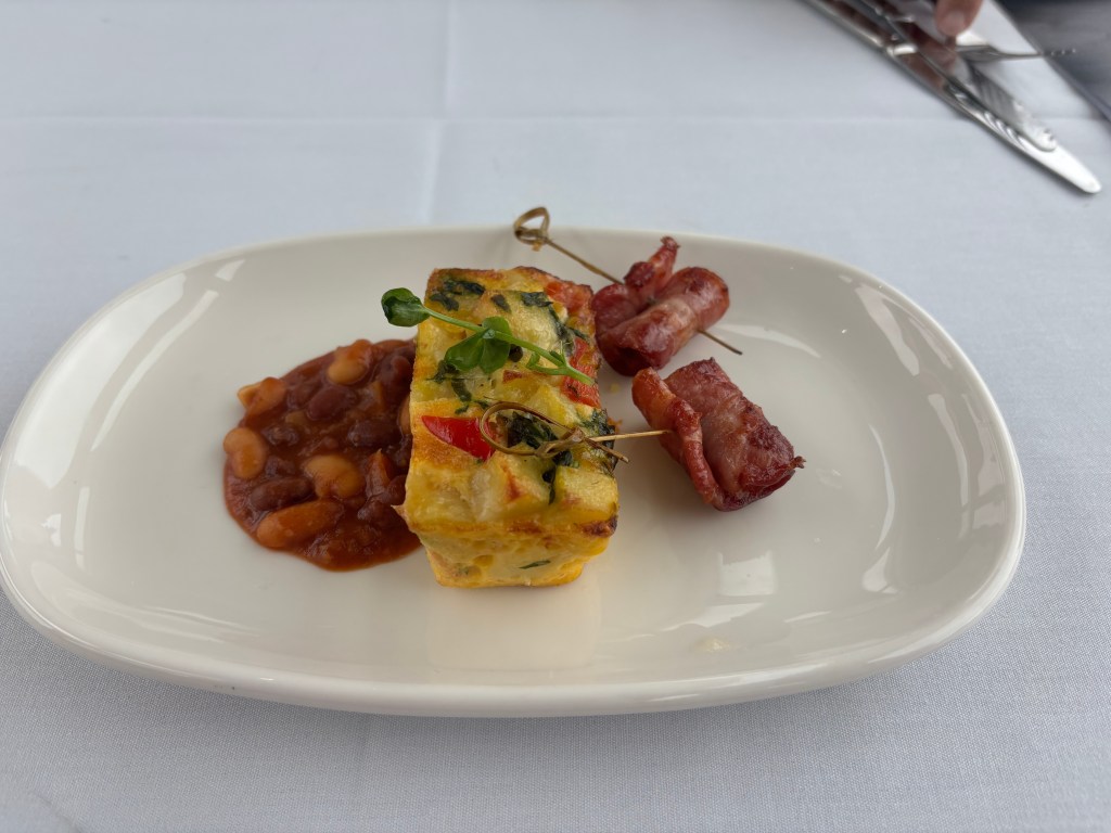 Breakfast followed not long after: a fresh seasonal vegetable frittata alongside spiced breakfast beans (a comforting Kiwi staple) and local crispy bacon. It was served with a glass of Hunter’s Miru Miru, a sparkling New Zealand wine whose name means “bubbles” in Māori. Simple, thoughtful, and perfect for a day spent watching the country unfold outside the window.
