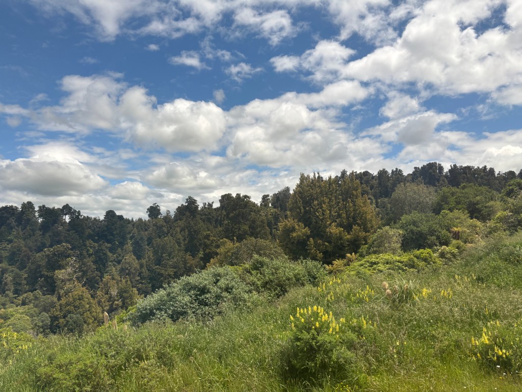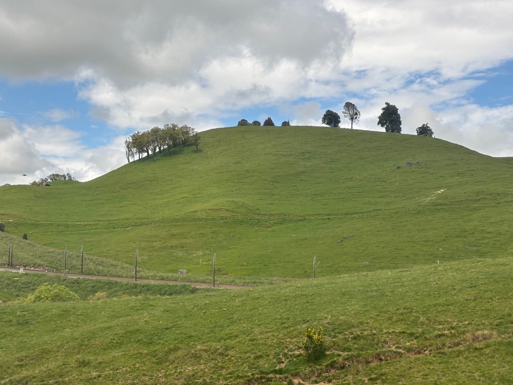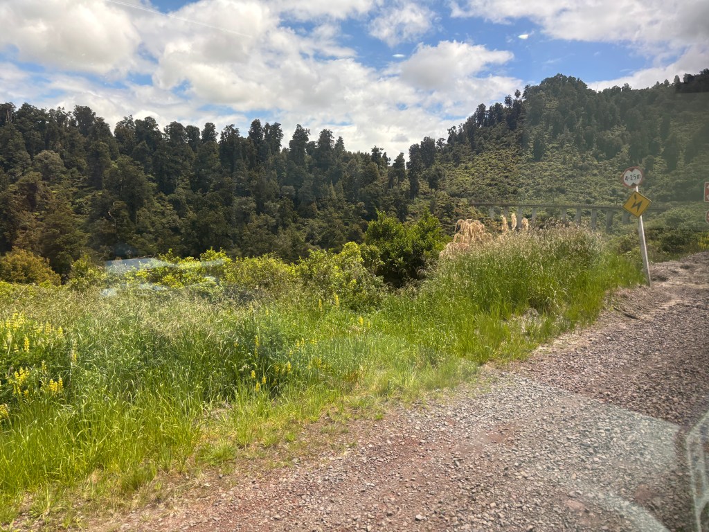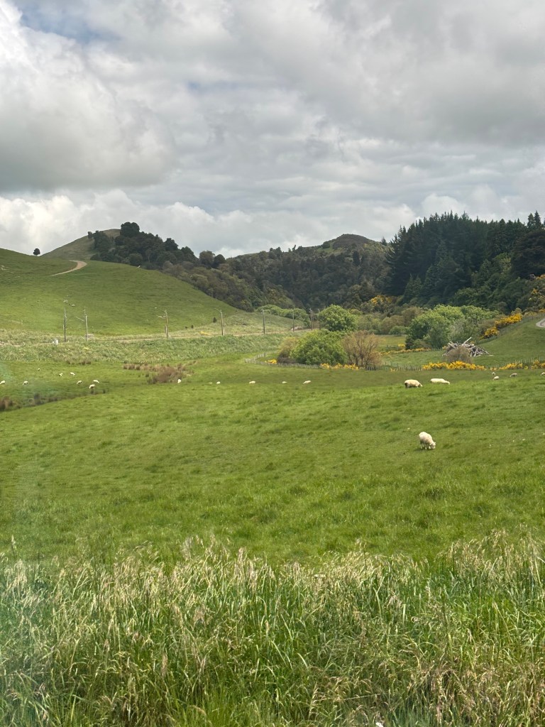 Between breakfast and lunch the scenery began to widen. Leaving the city, the train winds past the harborside suburbs before reaching the Kapiti Coast, where the Tasman Sea appears in sweeping views between stretches of native bush. North of there, the landscape turns pastoral — patchworked fields, neat farmhouses, and hills dotted with sheep that seem to outnumber every other living thing. Occasionally the train dipped into pockets of dense forest or crossed broad river valleys shaped by ancient volcanic forces.