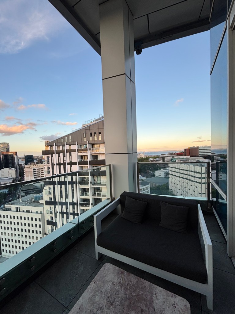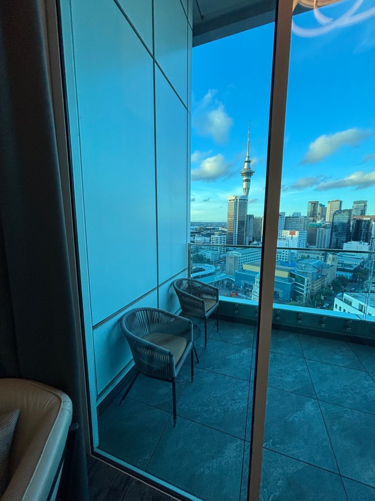 Stephen, ever the planner, somehow managed to secure the hotel’s only two-bedroom suite. Located on the 20th floor, it offered sweeping views of the city and its skyline. We had our own private balcony—perfect for morning coffee or watching the lights of the city come alive after sunset. The suite itself was spacious and thoughtfully laid out, complete with a fully equipped kitchen, separate living area, and two proper bedrooms with their own bathrooms. After a long travel day, it felt less like a hotel and more like a temporary home perched above Auckland’s urban pulse.