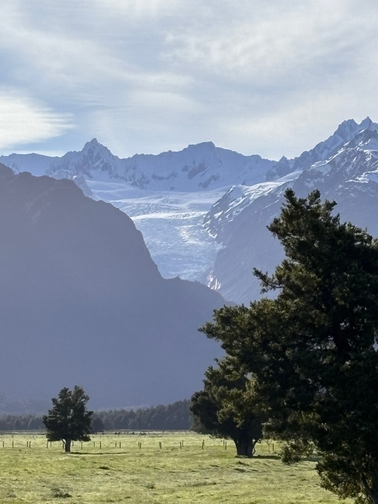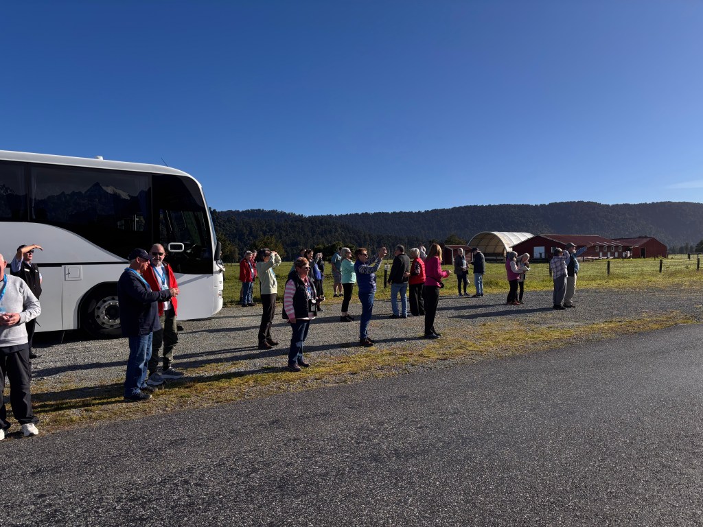 We boarded our coach at 7:45 a.m., bound for the Fox Glacier. We decided to skip the optional helicopter ride over Fox Glacier; it seemed a bit overpriced for what others later described as a very short trip — essentially up and down again.