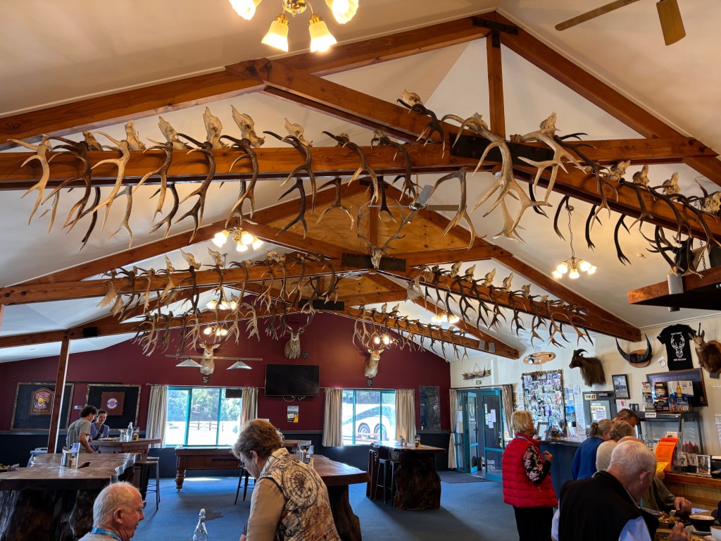 Lunch was at the Haast Hard Antler Restaurant & Bar — an interesting place though the buffet offerings were, once again, an odd mix: sausages in red sauce with cheese, a sirloin pie that was quite good, stir-fry, French fries and seafood salad.