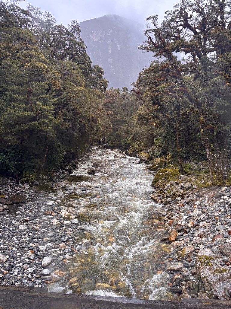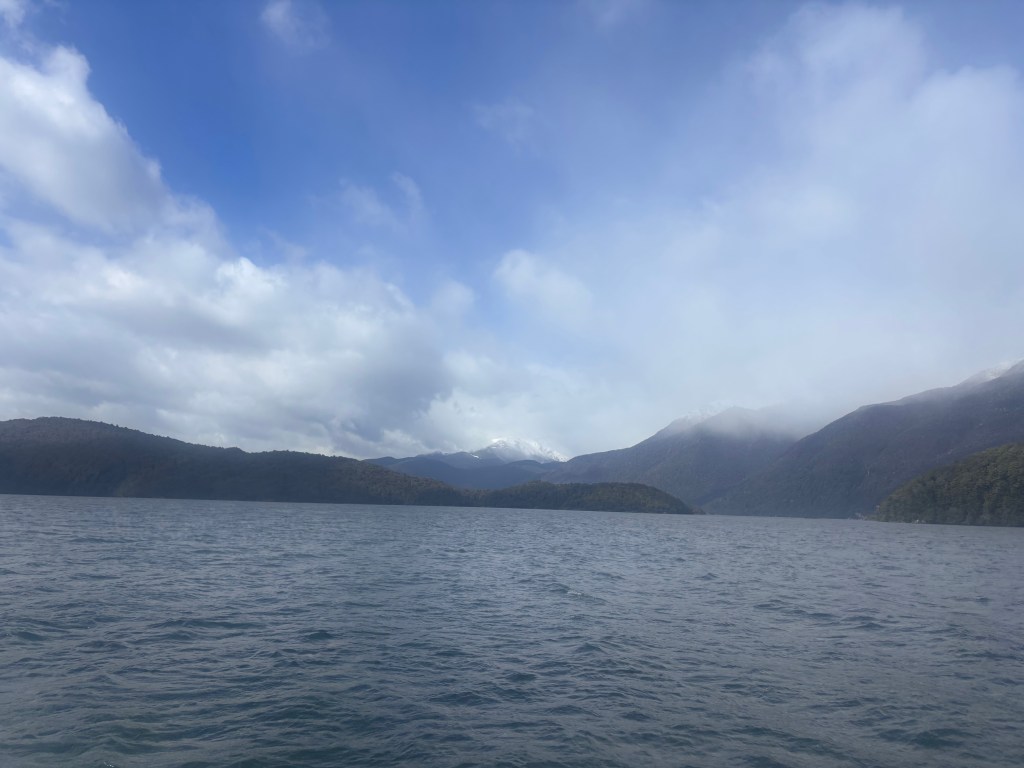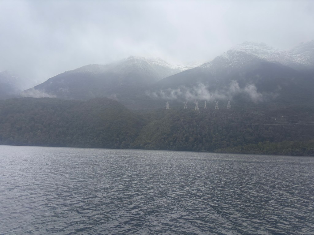 The viewpoint at the top gave us our first glimpse of Doubtful Sound far below—deep, glacially carved valleys filled with shifting mist and dark, still water. It already felt quieter than anywhere else we’ve been so far.