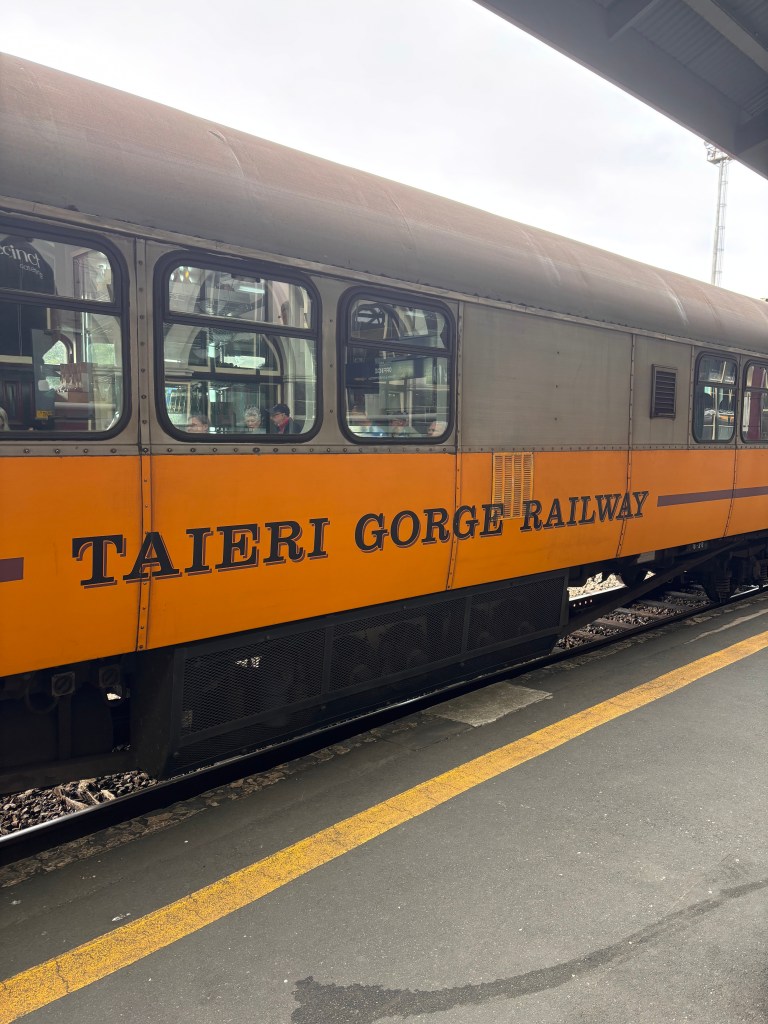 On this leg of the journey we were joined by several other travelers, all eager for the popular Taieri Gorge excursion. Once everyone was settled into the heritage carriages — many of them dating back to the 1930s and 40s — the train pulled away from Dunedin Railway Station and began its climb into the gorge. The line itself is a piece of history, originally part of the Otago Central Railway built in the 19th century, and today operated by Dunedin Railways as one of the region’s signature experiences.