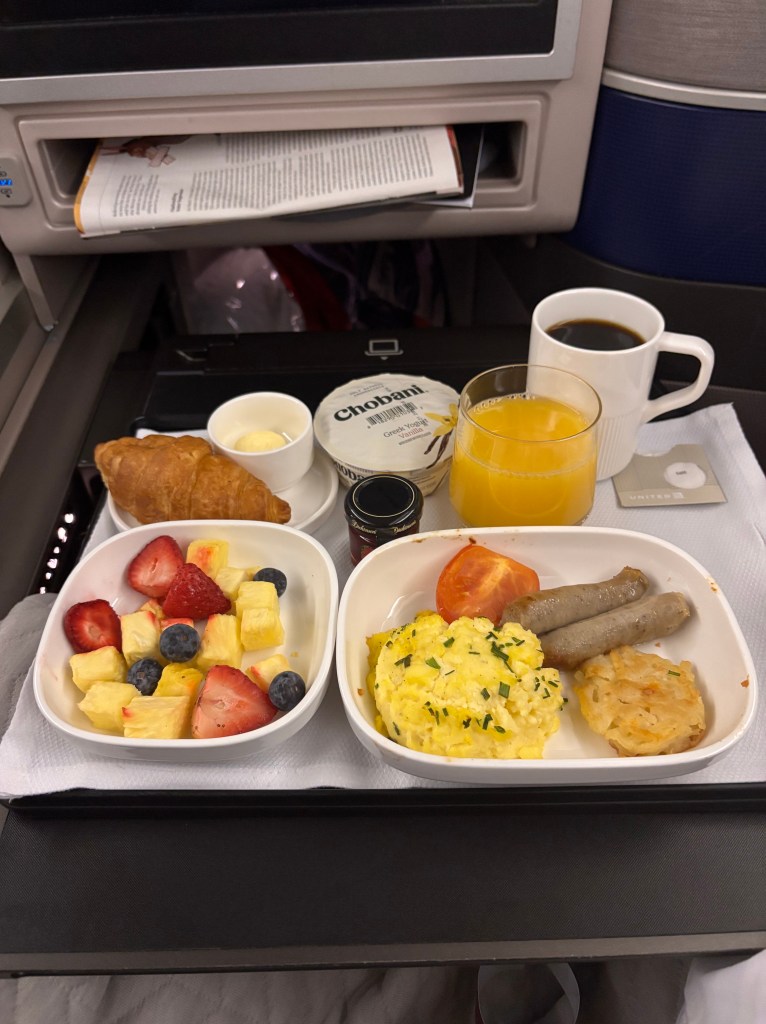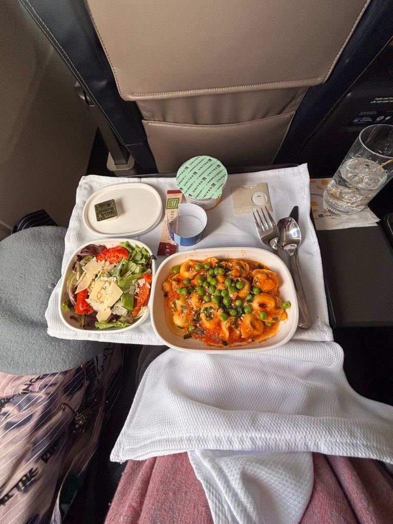 The flight attendants were friendly, but the food missed the mark. The tortellini came with peas (a curious choice) and was mostly cold. The salad was good, and the roll arrived fashionably late. I grabbed the “banana pudding in a cup” for later, but when I noticed the seal had popped, I decided to pass.