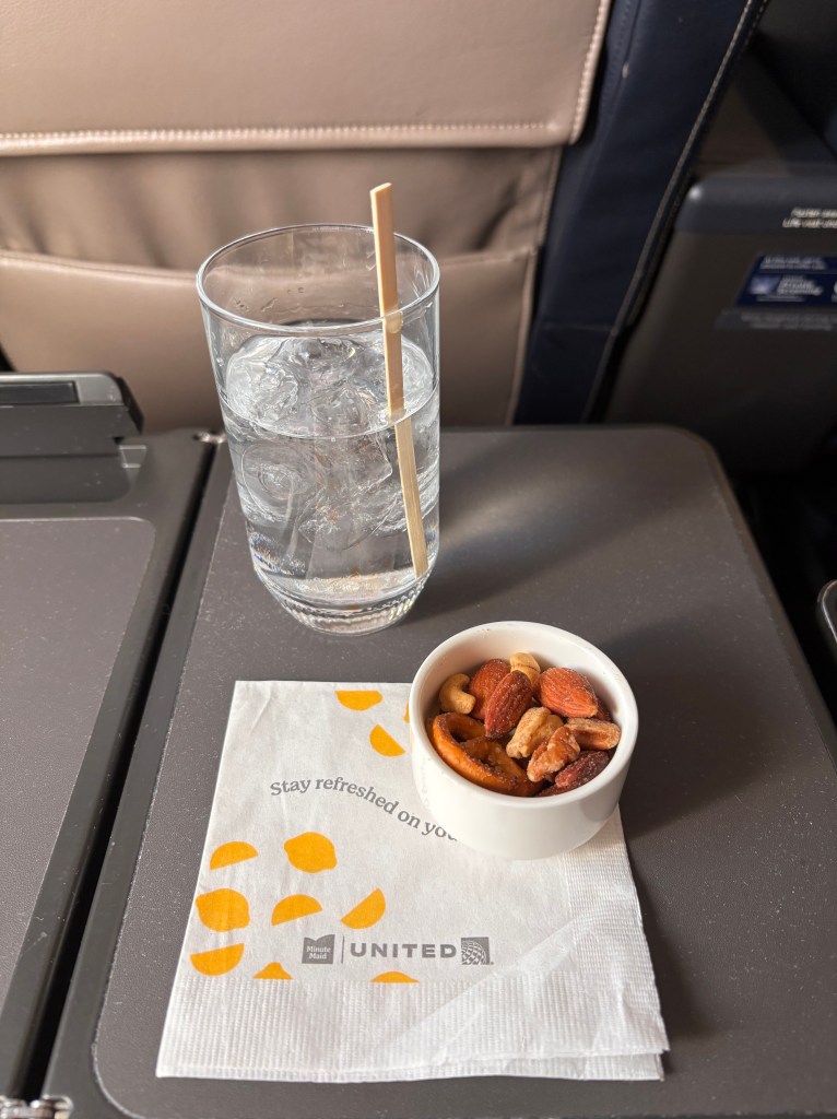 Boarding went smoothly enough, though overhead bin space filled up fast, even in First Class. Unfortunately, we had a rather unpleasant seatmate behind us — the kind of traveler who complains about everything. From his carry-on situation to the number of walnuts in the snack mix (“too many,” apparently), nothing seemed to please him. He even mentioned voting for Trump, which explained a lot.